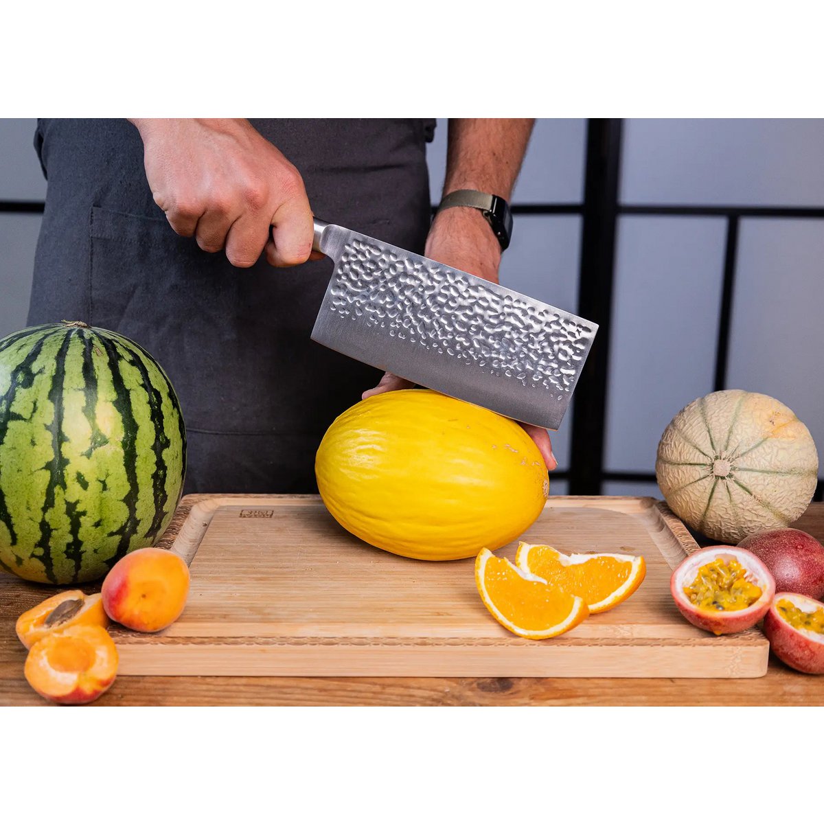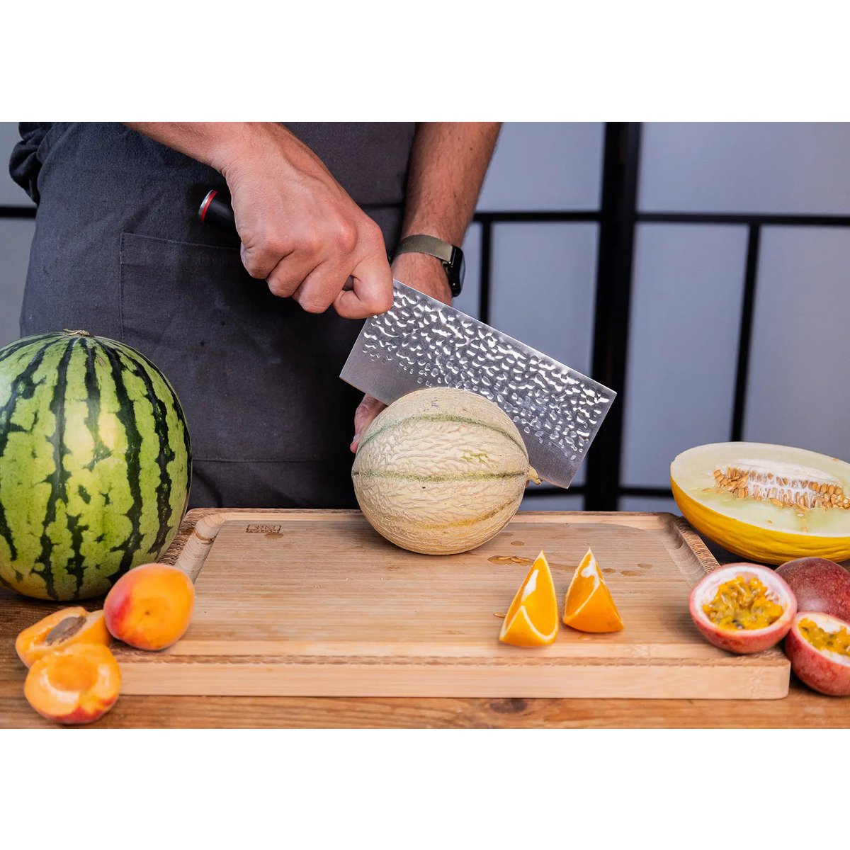 Mes - Cleaver, lemmet 19 cm. Vaak Chinees hakmes (中華包丁 chukabocho) genoemd, het brede lemmet is ideaal voor het snijden van grote stukken vlees, het bereiden van spareribs of het snel hakken van harde groenten zonder je pols te vermoeien.